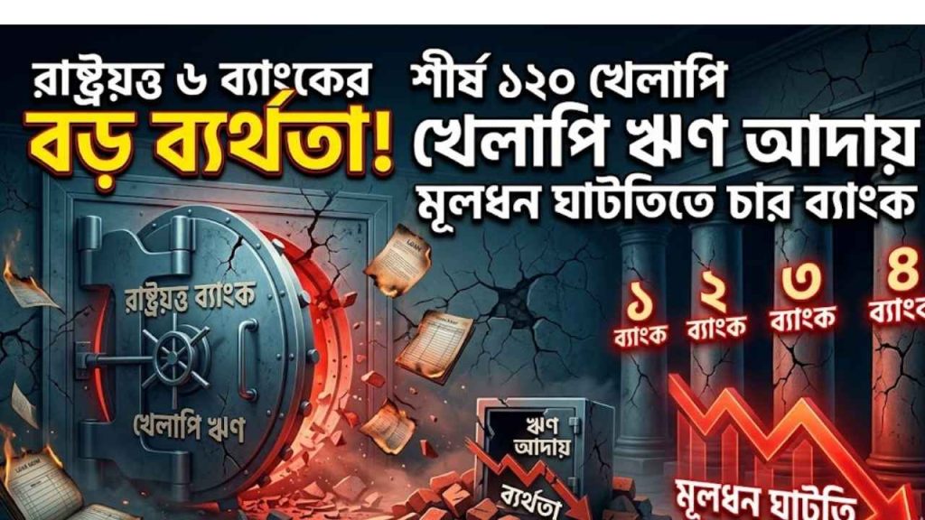 রাষ্ট্রমালিকানাধীন ছয়টি বড় ব্যাংক – সোনালী, অগ্রণী, জনতা, রূপালী, বেসিক ও বিডিবিএল – তাদের শীর্ষ ১২০ জন ঋণখেলাপির কাছ থেকে প্রত্যাশিত হারে ঋণ আদায় করতে পারছে না। শুধু তা-ই নয়, বিপুল খেলাপি ঋণ ও দুর্বল ব্যবস্থাপনার কারণে এই ছয় ব্যাংকের মধ্যে চারটিই এখন মূলধন ঘাটতিতে পড়েছে। এই প্রতিবেদনে আমরা অর্থ মন্ত্রণালয়ের সাম্প্রতিক পর্যালোচনার আলোকে বিস্তারিত বিশ্লেষণ দেব।